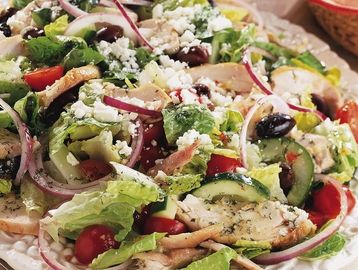 Romaine Mix With Roma Tomato, Cucumbers, Red Onions, Kalamata Olives All Tossed In Our Home Made Greek Feta Dressing-Topped With Grilled Chicken