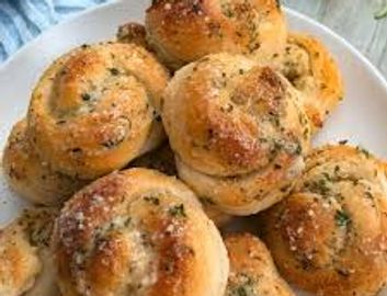 6 HOUSE MADE GARLIC KNOTS BRUSHED WITH GARLIC BUTTER AND BAKED WITH PARMESAN CHEESE-SIDE OF MARINARA FOR DIPPING